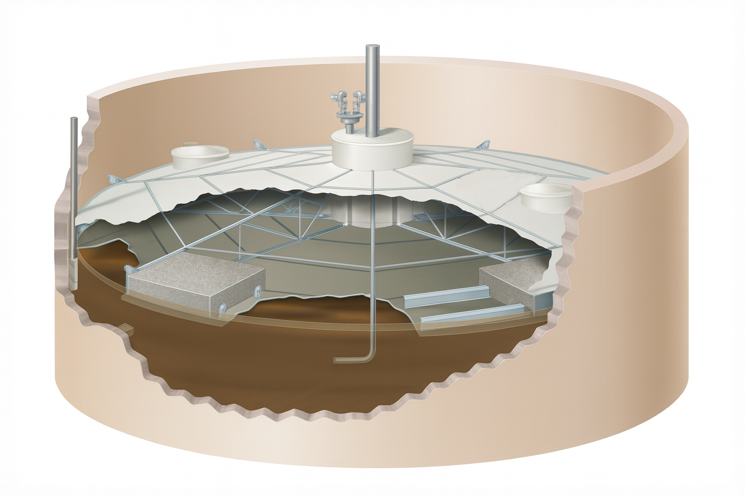 A gas dome located at the center of the cover provides a gas reservoir from which gas can be withdrawn without also removing entrained liquid, scum, foam, etc.Sampling wells, usually one near the center, one at about 1/2 radius. These wells have quick-opening hatches, with seal pipe extending below liquid, so that samples can be withdrawn without losing gas.