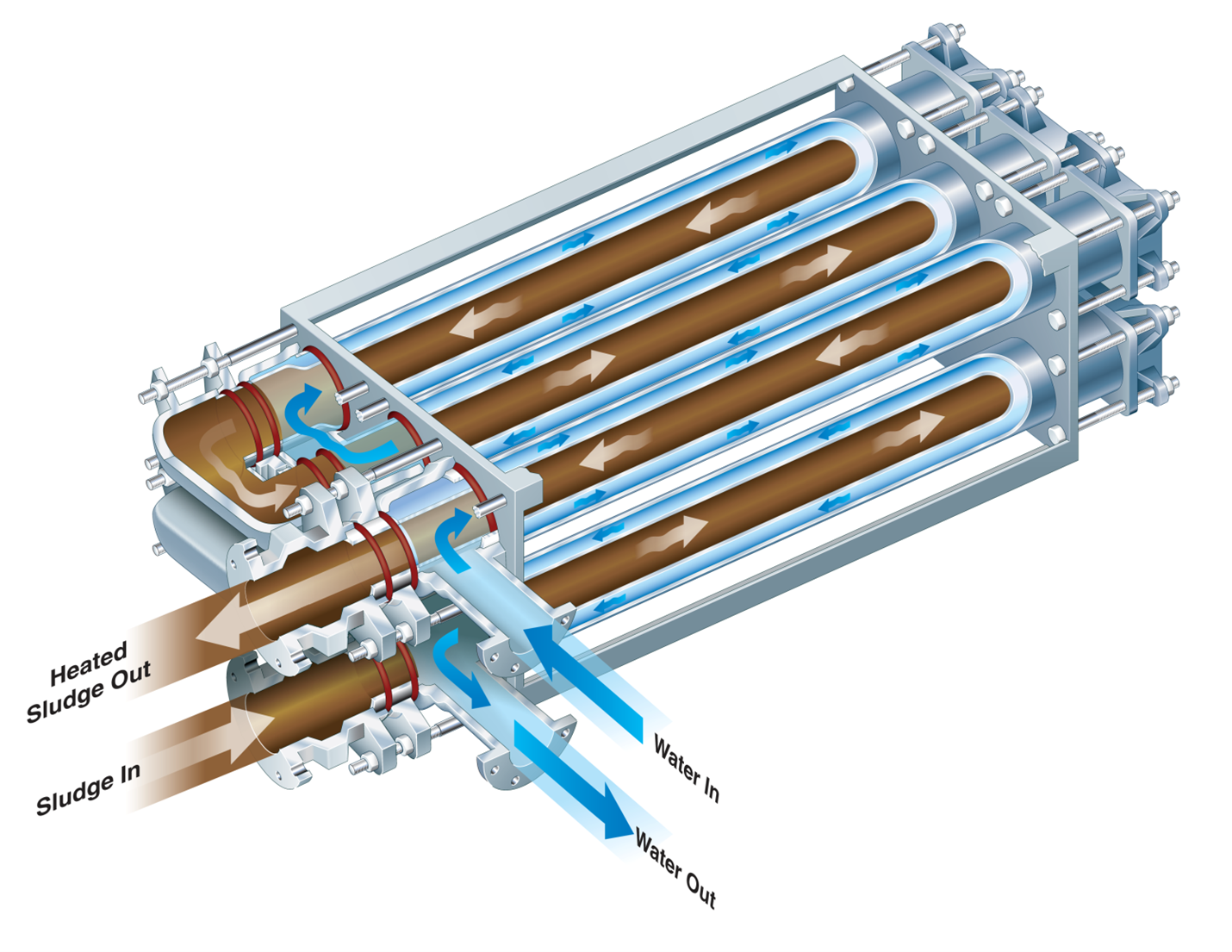 Walker Process sludge-to-sludge heat exchangers are concentric tube counterflow type that are the same as water-to-sludge heat exchangers but with a larger annular area between tubes. Sludge-to-Sludge heat exchangers are used with almost any temperature phased anaerobic digestion system.